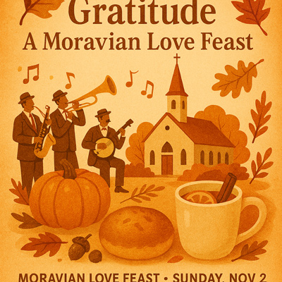 Our Moravian Love Feast on November 2 will be a contemporary version of this service, which will include: personal faith testimonies “gratitude reflections”, scripture readings and poetry, traditional Thanksgiving hymns, the Sacrament of Holy Communion, and music led by a Dixieland jazz band. We encourage you to arrive to the church sanctuary early that morning as the music will begin at least 15 minutes before the worship service begins. Traditional to a Moravian Love Feast, sweet bread will be shared during the worship service, and we will enjoy hot, mulled apple cider in Kemp Hall following worship.